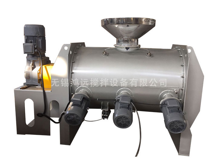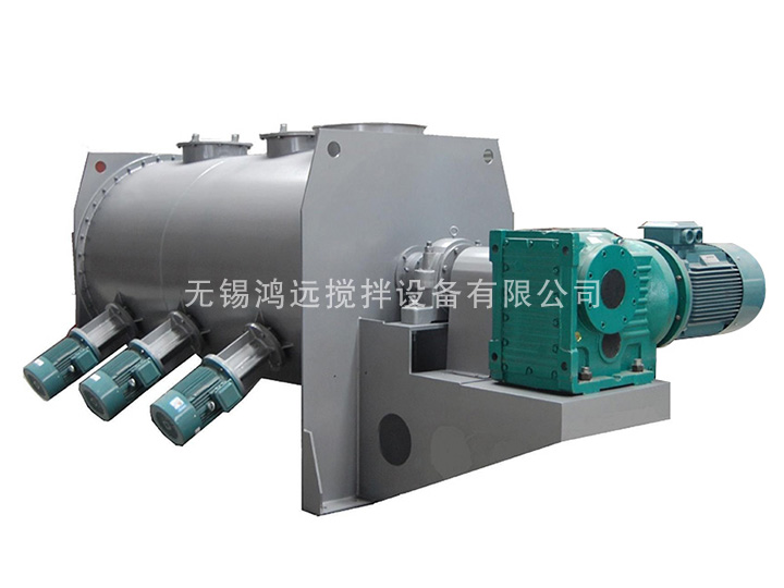 該機型由傳動機構、臥式筒體、犁刀、飛刀四部分組成。物料在犁刀作用下沿筒壁作對流運動,當物料流經飛刀時被高速旋轉的飛刀拋灑,從而在較短時間內達到均勻混合。能滿足大多固液混合以及造濕粒、干燥等復合工藝。