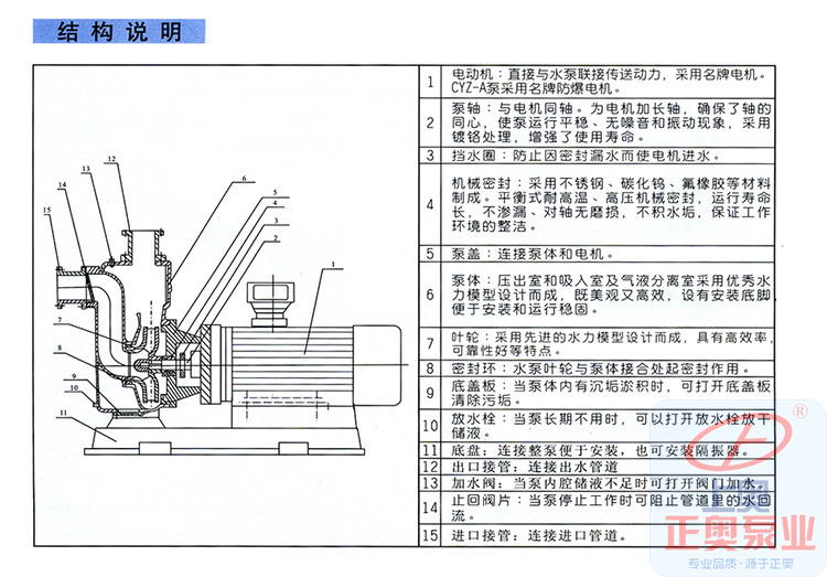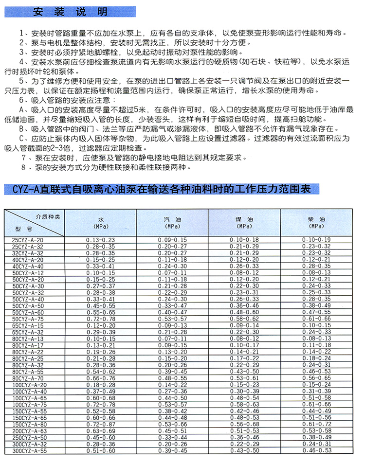 CYZ-A型自吸式離心油泵適用于石油行業(yè)、陸地油庫、油罐車的理想產(chǎn)品,并適合于作船用貨油泵、艙底泵、消防泵和壓載泵及機(jī)器冷卻水循環(huán)等,分別輸送汽油、煤油、柴油、航煤等石油產(chǎn)品和海水、清水,介質(zhì)溫度-20℃~140℃,如輸送化工液體可改用耐腐蝕機(jī)械密封。