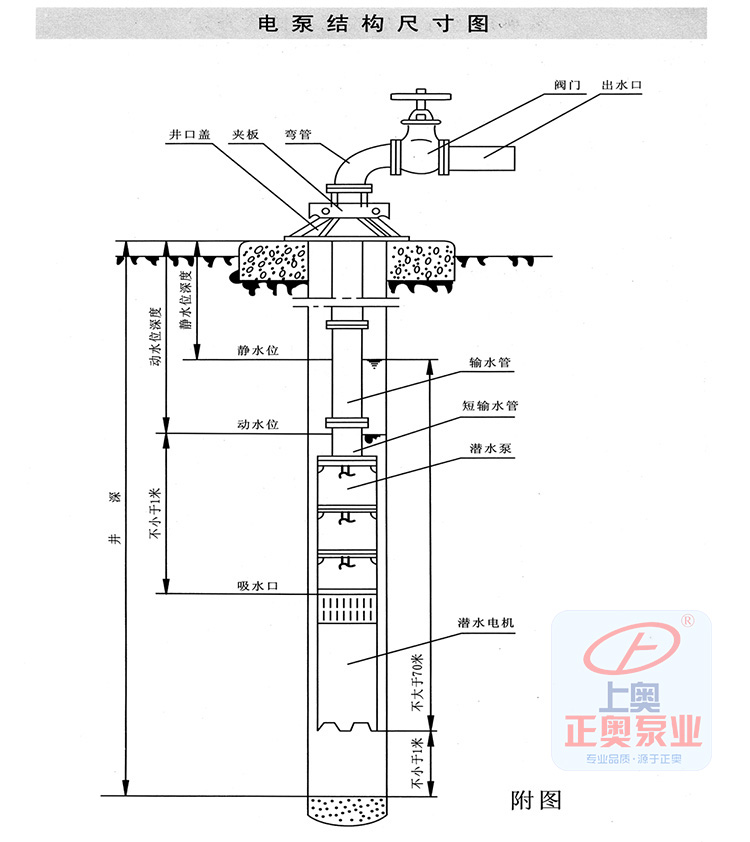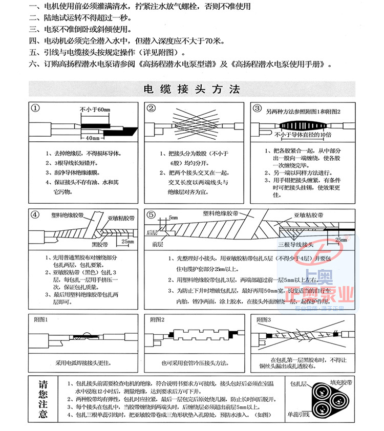 結構說明 1.QJ型潛水電泵機組由:水泵、潛水電機(包括電纜)、輸水管和控制開關四大部分組成。潛水泵為單吸多級立式離心泵:潛水電機為密閉充水濕式、立式三相鼠籠異歩電動機,電機與水泵通過爪式或中.鍵筒式聯軸器直接;配備有不同規格的三芯電纜:起動設備為不同容量等級的空氣開關和自耦減壓起動器、輸水管為不同直徑的鋼管制成,采用法蘭聯接,高揚程電泵釆用閘閥控制。 2.潛水泵每級導流殼中裝有一個橡膠軸承;葉輪用錐形套固定在泵軸上:導流殼采用嫘紋或螺栓聯成一體。 3.高揚程潛水泵上部裝有止回閥,避免停機水錘造成機組破壞。 4.潛水電機軸上部裝有迷宮式防砂器和兩個反向裝配的骨架油封,防止流砂進入電機。 5.潛水電機采用水潤滑軸承,下部裝有橡膠調壓膜、調壓彈簧,組成調壓室,調節由于溫度引起的壓力變化;電機繞組采用聚乙烯絕緣,尼龍護套耐水電磁線,電纜聯接方式按QJ型電纜接頭工藝, 把接頭絕緣脫去刮凈漆層,分別接好,焊接牢固,用生橡膠繞-層。再用防水粘膠帶纏2~3層,外面包上2〜3層防水膠布或用水膠粘結包一層橡膠帶(自行車里胎〉以防滲水。 6.電機密閉,采用精密止口螺牷,電纜出口加膠塾進行密封。 7.電機上端有一個注水孔,有一個放氣孔,卜部打個放水孔。 8.電機下部裝有上卜—止推軸承,止推軸承上有溝槽用干冷卻,和它對磨的是不銹鋼推力盤,承愛水泵的上廠軸向力。
