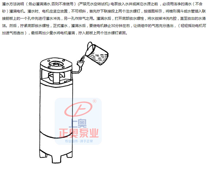 切記電機下井前必須注滿清水,擰緊注水,放氣螺塞,否則不準使用。