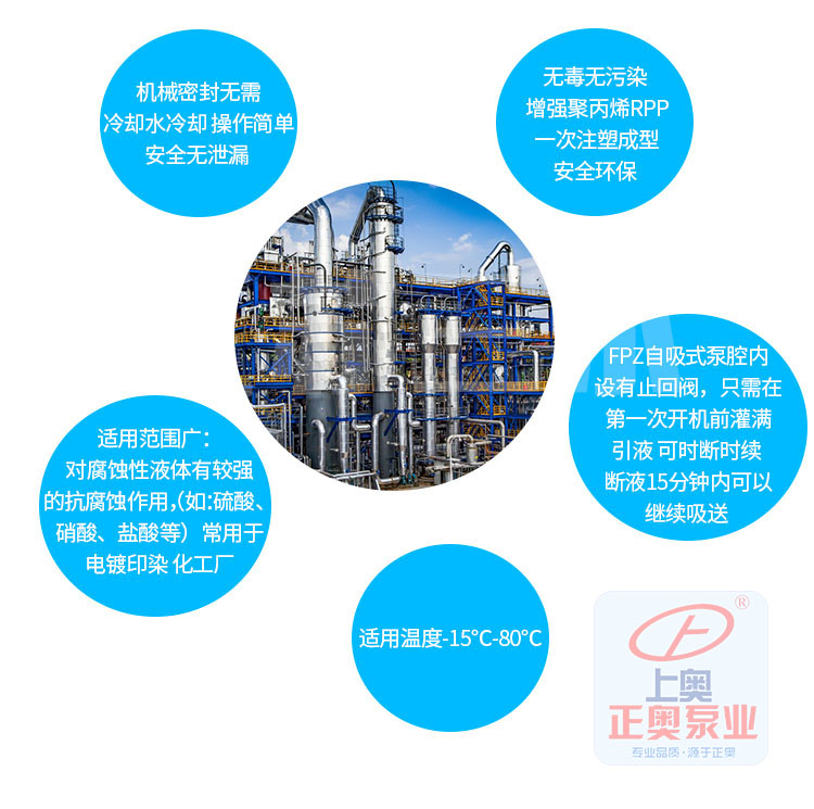 正奧公司生產的101型、102型、103型、104型、105型泵系單吸直聯式塑料離心泵是一種小型塑料泵,產品結構、體積小、重量輕、耗電省、耐酸堿、密封好、維修方便。FS型工程塑料離心泵系列產品均采用機械密封,并引進國際工藝和技術配方,全使用改性ABS(工程塑料)作為泵的材質,在同系列的塑料泵產品中,充分顯示了其結構重量輕、體積小、壽命長等特點,廣泛應用于化工,食品、制藥、電鍍、造紙、環保、水處理等部門,輸送酸、堿、鹽等腐蝕性液體。其中104型采用220V電壓,可供家庭選用。