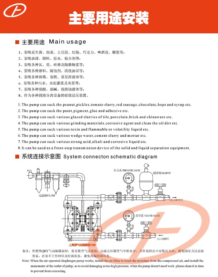 QBY型氣動隔膜泵是一種采用壓縮空氣為動力源,通過氣閥往復(fù)運動分配空氣,帶動隔膜擠壓輸送介質(zhì)的容積式泵,該泵集雜質(zhì)泵、自吸泵、泥漿泵、屏蔽泵、潛水泵等輸送機械的優(yōu)點。該系列泵具有結(jié)構(gòu)美觀,良好的物理抗性,經(jīng)久耐用等特點,對于各種腐蝕性液體、帶顆粒、高粘度、易揮發(fā)、易燃、易爆、劇毒的液體、陶瓷釉漿、果漿、膠水、油輪倉底油回收、臨時倒罐等液體均能予以抽光吸盡,尤其可以解決葉片式泵的跑、冒、滴、漏及不允許空轉(zhuǎn)等問題,該系列產(chǎn)品可利用普通干凈的工業(yè)氣或儀表氣,在0.1公斤的低壓下啟動,在正常輸送狀況下節(jié)約用氣量30%以上,具有良好的市場前景。