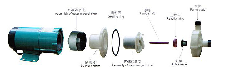 此泵運轉是在連軸上和葉輪上分別裝配有磁性材料而互相吸引偶合,無需配以傳統機械軸封,因而是完全密封的。電動機轉動扭力是通過主動磁及從動磁的引力帶動葉片工作運轉。現今慣用的磁力驅動泵極大的缺點是在缺液情況下絕對嚴禁運轉否則整機將毀壞,給使用者增添不必要的麻煩和煩惱。它采選了一種特別設計的特配方陶瓷作軸承,具有極強的耐磨性和抗腐蝕性,使其先進性能和質量安全得以絕對的保證。
