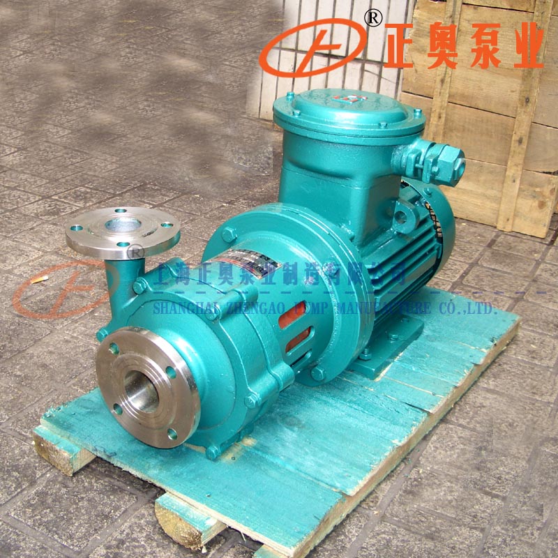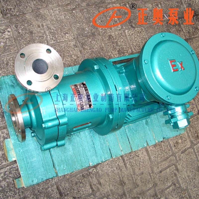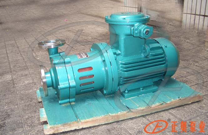 CQG型耐高溫磁力驅動泵(耐溫≤250℃)(簡稱磁力泵)通常由電機,磁力偶合器水冷卻裝置和耐腐蝕離心泵四大部分組成,其主要特點是利用磁力偶合器傳遞動力,完全無泄漏。當電動機帶動磁力偶合器的外磁鋼旋轉時,磁力線穿過了間隙和隔離套,作用與內磁鋼上,使泵轉子與電動機同步旋轉,無機械接觸地傳遞扭矩。在泵的動力輸入端,由于液體被封閉在靜止的隔離套內,沒有動密封因而無泄漏,磁力偶合器的磁性材料采用了高溫介質而保持強大的磁力扭矩。在電機與磁力偶合器之間加裝了水冷卻裝置,防止泵送高溫介質之熱量傳導至電機。以保持電機的正常運轉,從而達到無泄露輸送高溫介質。