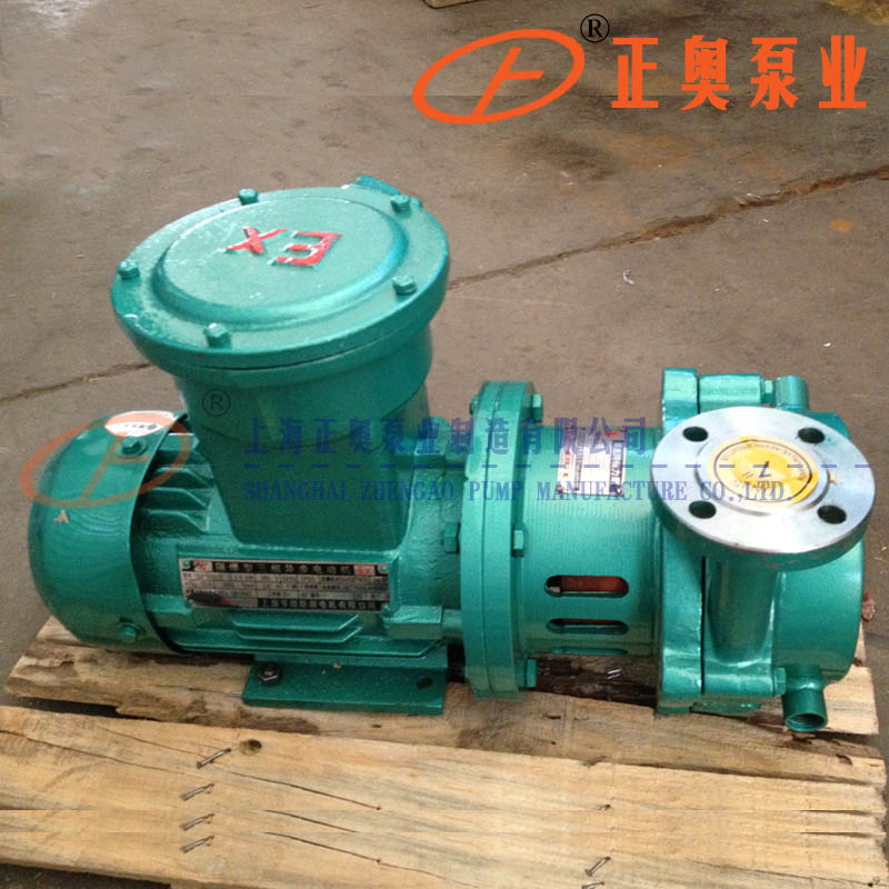 CQGB型高溫保溫磁力泵(耐溫≤250℃)(簡稱磁力泵)通常由電機,磁力偶合器水冷卻裝置和耐腐蝕離心泵四大部分組成,其主要特點是利用磁力偶合器傳遞動力,完全無泄漏。當電動機帶動磁力偶合器的外磁鋼旋轉時,磁力線穿過了間隙和隔離套,作用與內磁鋼上,使泵轉子與電動機同步旋轉,無機械接觸地傳遞扭矩。在泵的動力輸入端,由于液體被封閉在靜止的隔離套內,沒有動密封因而無泄漏,磁力偶合器的磁性材料采用了高溫保溫介質而保持強大的磁力扭矩。在電機與磁力偶合器之間加裝了水冷卻裝置,防止泵送高溫保溫介質之熱量傳導至電機。以保持電機的正常運轉,從而達到無泄露輸送高溫保溫介質。