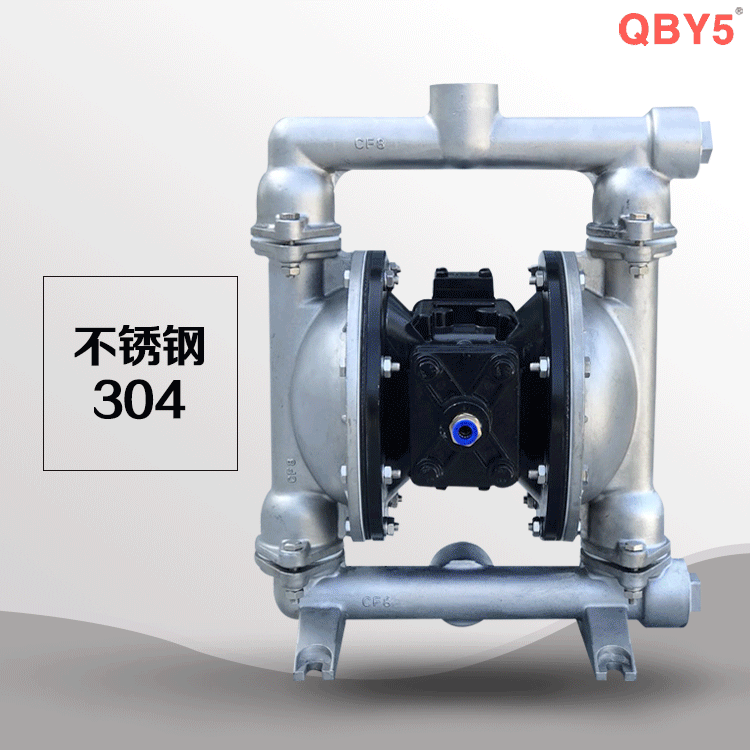 QBY5系列氣動隔膜泵工作原理:在隔膜泵的兩個對稱工作腔中,各裝有一塊有彈性的隔膜,連桿將兩塊隔膜結成一體,壓縮空氣從泵的進氣接頭進入氣閥室后,推動兩個B工作腔內的隔膜,驅動連桿聯結的隔膜同步運動。與此同時,另一工作腔中的氣體則從其隔膜的背面排出泵外。當活塞達到行程終點,閥機構則自動的將壓縮空氣引入另一工作腔,推動隔膜泵朝反向運動,這樣就形成了兩個隔膜的現步往復運動。每個工作腔中又設置兩個單向球閥,隔膜的往復運動,造成工作腔內容積的改變,迫使兩個單向球閥交替的開啟和關閉,從而使液體連續的吸入和排出。