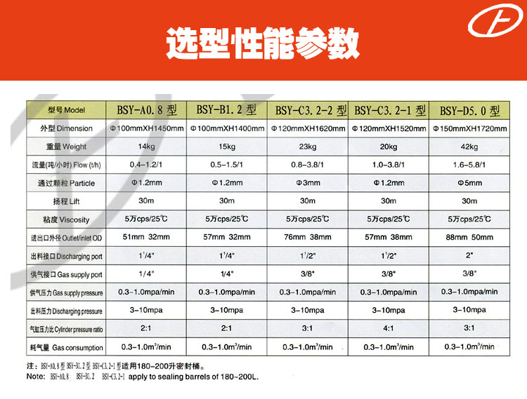 注:BSY-A0.8型、BSY-B1.2型、BSY-C3.2-1型適用180-200L密封桶,即做氣動(dòng)油桶泵。 泵適用于低中高黏度,干、濕法仿此合成革生產(chǎn)線上的漿料的自動(dòng)輸送,及油料的輸送。