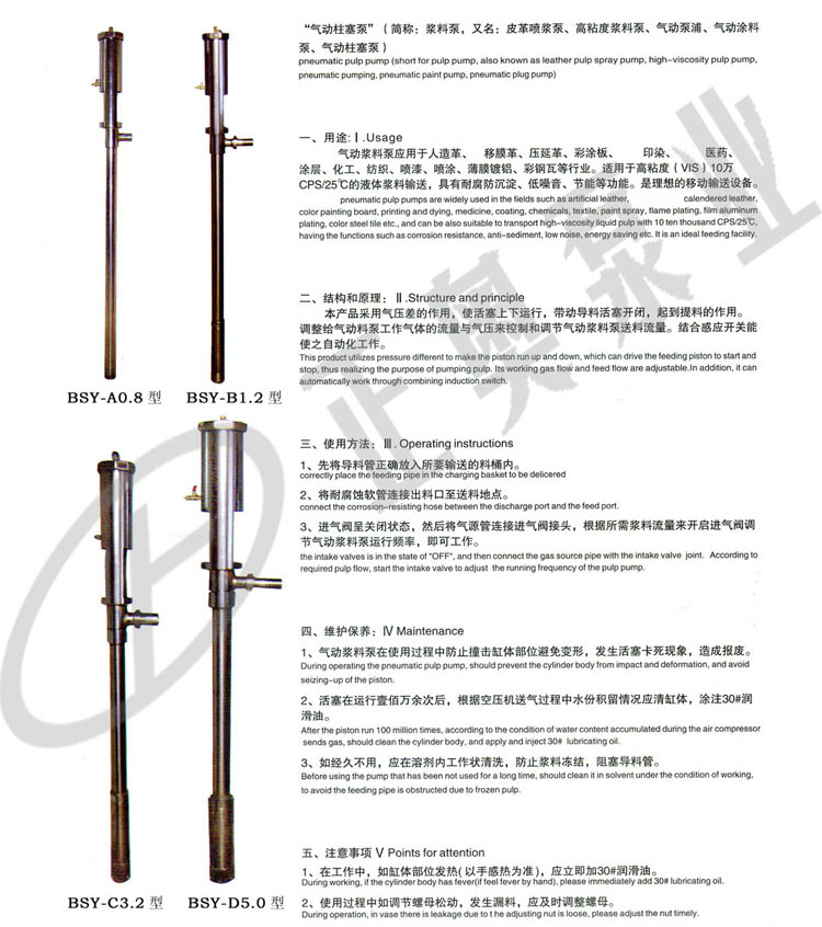 BSY-A0.8型氣動(dòng)漿料泵(柱塞泵)(簡(jiǎn)稱:氣動(dòng)油桶泵,又稱氣動(dòng)漿料泵、皮革漿料泵、打料漿料泵、氣動(dòng)抽液泵、氣動(dòng)柱塞泵、打料泵浦、氣動(dòng)泵浦、氣動(dòng)涂料泵)。氣動(dòng)漿料泵應(yīng)用于人造革、移膜革、壓延革、彩涂板、印染、醫(yī)藥、涂層、化工、紡織、噴漆、噴涂、薄膜鍍鋁、彩鋼瓦等行業(yè)。適用于高粘度(VIS)≤12萬(wàn)CPS/25℃的化工漿料輸送,具有防爆耐腐防沉淀、低噪音、等功能。是理想的移動(dòng)輸送設(shè)備。