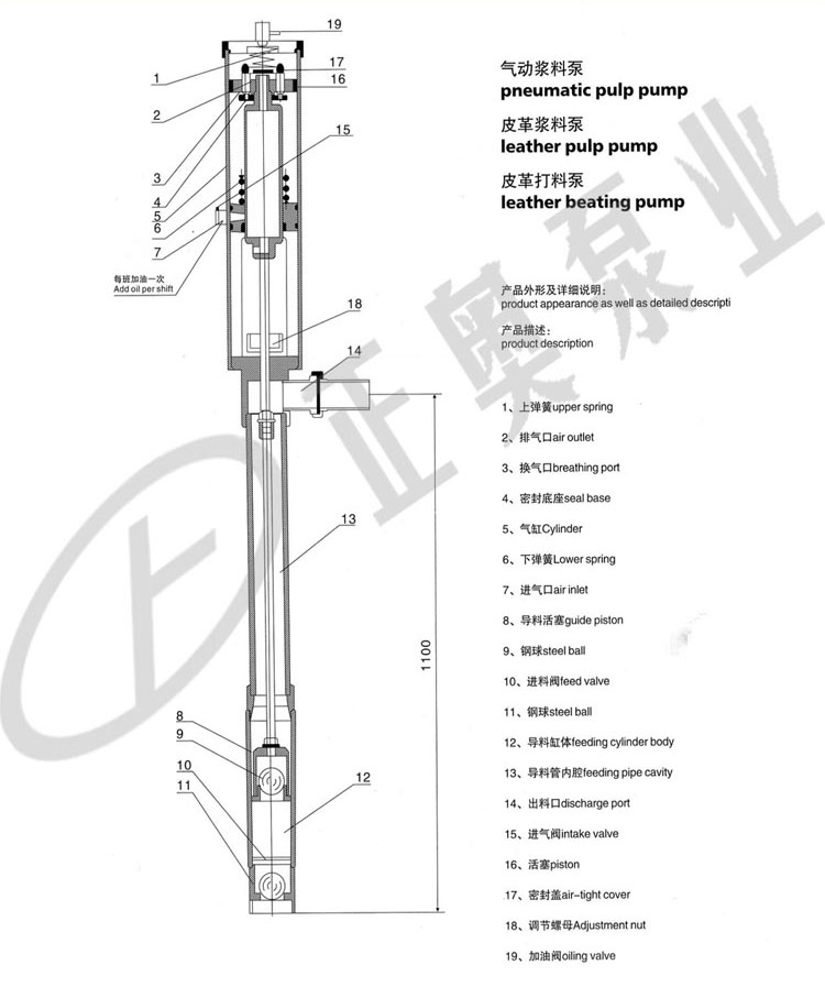 正奧氣動(dòng)漿料泵產(chǎn)品采用氣壓差的作用,使活塞上下運(yùn)行,帶動(dòng)導(dǎo)料活塞開(kāi)閉,起到提料的作用。 具體裝置如圖(一)所示: 1、缸體 2、進(jìn)氣閥 3、彈簧 4、彈簧 5、活塞 6、排氣管 7、換氣管 8、密封底座 9、密封上蓋 10、漿料缸體 11、進(jìn)料口 12、漿料活塞 13、進(jìn)料鋼球 14、鋼球 15、連桿 16、漿料管 17、出料口 18、加油閥 19、放氣閥