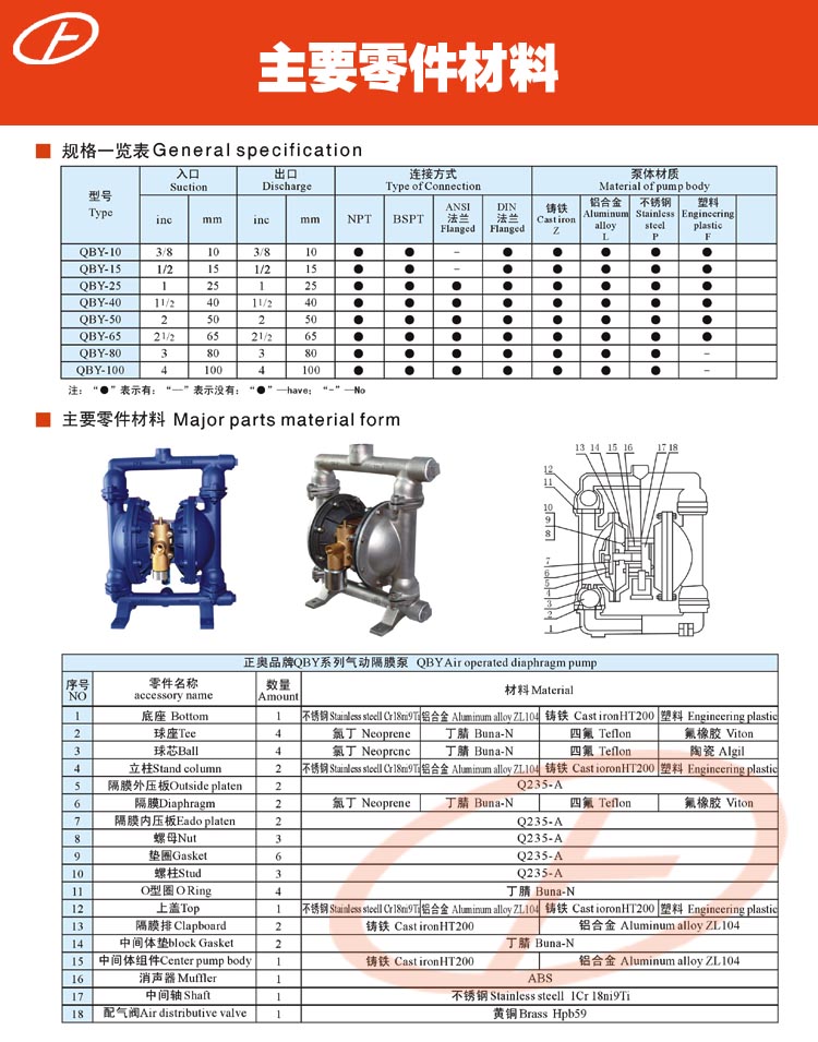 正奧公司目前已形成系列化生產,共有八種規格直徑:φ10mm(3/8')、φ15mm(1/2')、φ25mm(1')、φ40mm(11/2')、φ50mm(2')、φ65mm(21/2')、φ80mm(3')、φ100mm(4')。五種材質:鋁合金、鑄鐵、不銹鋼、工程塑料、襯里(襯膠隔膜泵,襯氟隔膜泵)。隔膜泵根據不同液體介質分別采用丁晴橡膠、氯丁橡膠、氟橡膠、聚四氟乙烯隔膜。以滿足不同用戶的需要。
