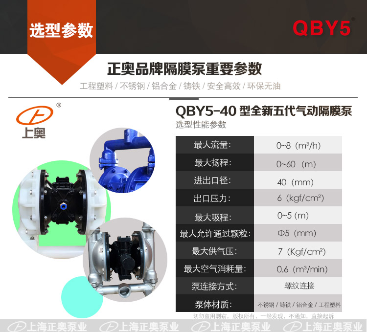 QBY5-F型氣動隔膜泵是我公司開的第五代氣動隔膜泵,QBY5型正奧氣動隔膜泵是上海正奧泵業(yè)有限公司氣動隔膜泵的外形進一步改進,機械外觀更美;不卡機,無油氣動隔膜泵,高吸程大流量隔膜泵,可與進口隔膜泵媲美,氣動隔膜泵并對性能的進一步加強,效率更高;歡迎選擇上奧牌氣動隔膜泵。