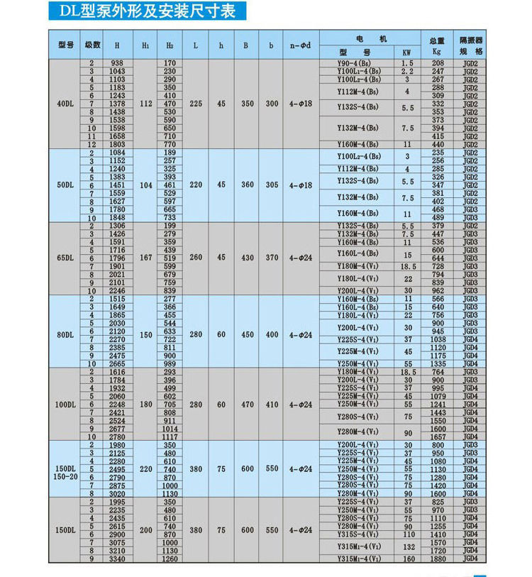 五、DL系列立式多級離心泵選型參數: